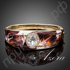 Этот великолепный браслет представляет собой широкое кольцо, соединенное из двух половинок с одной стороны шарниром, а с другой – замком. В центре изделия расположен прозрачно-белый овальный камень – швейцарский фианит совершенной огранки, обрамленный мелкими круглыми кристаллами. А вокруг него находится абстрактная картина с преобладающим бордовым цветом и оранжевыми, красными, белыми и золотыми узорами. За счет применения эмали достигается эффект использования масляных красок.