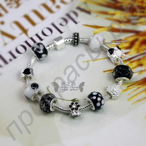 Предлагаемая модель украшена не только черными и белыми бусинами, но еще и разнообразными дисками с узорами и сердечками, придающими его дизайну игривость и пленительность. Корпус данного браслета выполнен из высокопрочного металлического сплава и покрыт настоящим серебром 925 пробы, холодный оттенок которого идеально сочетается с удивительным блеском стеклянных бусин.