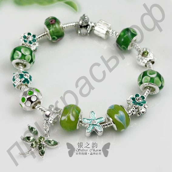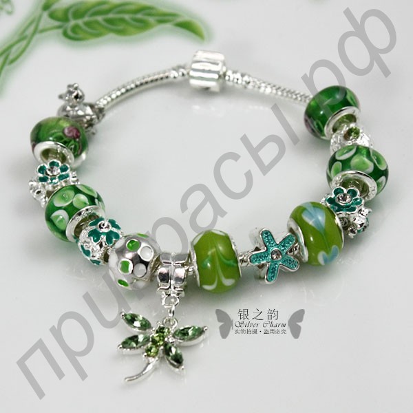 Холодное сияние серебра, покрывающее поверхность браслета, будет звучать в унисон с яркостью сияния глаз женщины. Главным украшением этого потрясающего изделия стали чудесные зеленые бусинами с рисунками цветов. Эти потрясающие декоративные элементы из муранского стекла делают красоту дамы нежной и чувственной, а фигурки цветов придают облику девушки игривость. Особенно же оригинально выглядит подвеска в виде стрекозы, воплощающая легкость и независимость представительницы прекрасного пола. Чудесный европейский браслет с зелеными бусинами станет тем акцентом в облике дамы, который поможет ей сделать свою красоту совершенной.