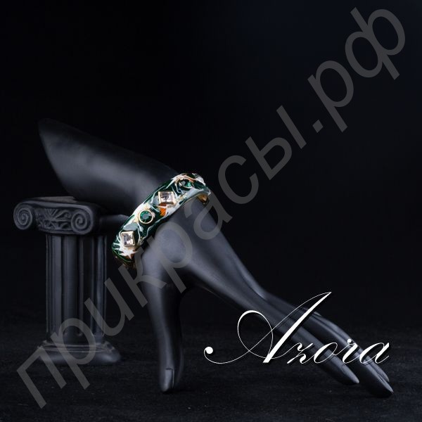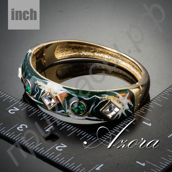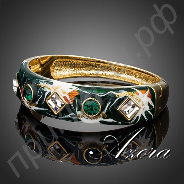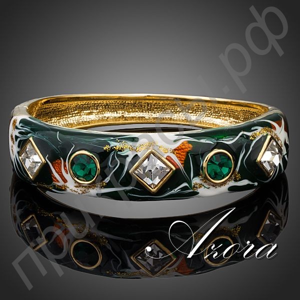 Этот замечательный браслет представляет собой широкое кольцо, соединенное из двух половинок с одной стороны шарниром, а с другой – замком. Лицевая часть изделия украшена великолепным геометрическим орнаментом из сияющих австрийских кристаллов. Чередуются между собой ограненные камни в ободковой оправе: круглый зеленый и ромбовидный прозрачно-белый. А вокруг кристаллов находится абстрактная картина с преобладающими оттенками зеленого и оранжевыми, белыми, а также золотистыми узорами. За счет применения эмали достигается эффект использования масляных красок.