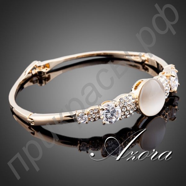 Этот утонченный браслет представляет собой тонкое металлическое кольцо, соединенное из трех частей шарнирами и замком. Наибольшая часть – лицевая, она украшена восхитительными вставками из высококачественного кубического циркония. В центре расположен круглый, идеально гладкий матовый камень бежевого оттенка в ободковой оправе. С двух сторон от него симметрично размещены чередующиеся вставки из прозрачных квадратных кристаллов в крапановой оправе и мелких сияющих камней. Интересно, что при удалении из центра уменьшаются размеры вставок. Изящную композицию отлично дополняет превосходная позолота изделия. Украшение выглядит очень изящно и стильно.