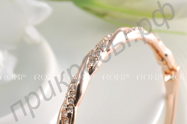 Браслет представляет собой тонкий металлический обруч, покрытый сверкающей розовой позолотой, лицевая часть которого декорирована элегантным плетением. Сделать выгодный акцент на декоративном узоре помогает контрастное сочетание матового блеска позолоты с ослепительным сверканием швейцарских кристаллов, которые формируют затейливый узор на одном из жгутов плетения. Элегантный и сдержанный дизайн браслета, его изящные и женственные формы подчеркивают хрупкость дамского запястья и придают грациозность каждому жесту.