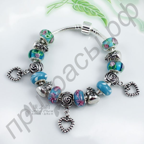 Данный браслет выполнен из прочного металлического сплава, который покрыт настоящим серебром. На корпус предлагаемого изделия нанизаны чудесные стеклянные бусины потрясающего голубого оттенка, который превосходно подойдет и блондинкам, и дамам с темными волосами. Помимо голубых бусин с узорами цветов, этот браслет украшен металлическими бусинами и звоночками, а также подвесками в виде сердца.