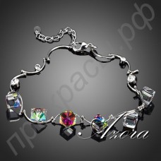 Это потрясающее изделие станет ярким и романтичным дополнением к вечерним, деловым и даже повседневным образам. Его корпус выполнен из цинкового сплава и по форме напоминает легкую веточку растения с превосходными листочками и цветочками из необычных кристаллов. Круглые прозрачные кристаллы дополняются кубиками удивительных оттенков с мягким переходом от прозрачного к загадочному синему. Данное изделие имеет неповторимый серебристый цвет, поэтому его можно использовать с нарядами в любых цветов. С помощью предлагаемого браслета женщина сможет сделать свой облик чарующим и обаять всех окружающих мужчин.