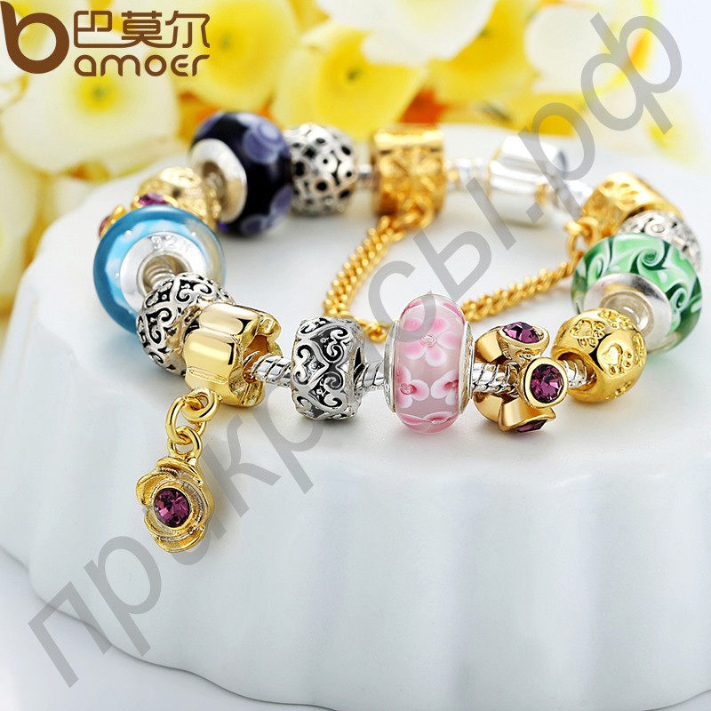 Яркий браслетик в европейском стиле с неповторимыми бусинами ручной работы из цветного муранского стекла станет великолепным пополнением вашего ларчика с украшениями. Этот аксессуар лучшим образом дополнит лёгкий повседневный наряд, насыщенная палитра украшения хорошо сочетается и с одноцветным костюмом, и с пёстрым платьицем. Сочетание зелёного, голубого, чёрного, сиреневого и розового оттенков делает это ювелирное изделие ярким акцентом на женском запястье. Этот эффектный нюанс без сомнения привлечёт множество заинтересованных взглядов и комплиментов. Вес изделия - 50 г, длину браслета вы можете выбрать самостоятельно, указав в специальной строке необходимый размер.
