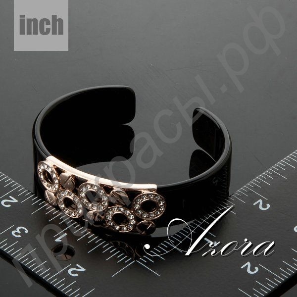 Корпус предлагаемого браслета представляет собой широкое черное полукольцо, оттеняющее белизну кожи дамы и изящество ее запястья. Конструкция браслета не предусматривает лишних застежек и заклепок, что делает его ношение более удобным. Простота корпуса компенсируется необычным декоративным элементом в виде позолоченных и инкрустированных кристаллами заклепок. В дизайне данного украшения есть нотки свободной и бросающей вызов нормам рок-культуры, поэтому этот браслет будет особенно актуально выглядеть на яркой вечеринке. Благодаря доминированию в оформлении браслета простых линий и сдержанной цветовой гамме, предлагаемое изделие может быть смело использовано в деловых образах, которые совершенно по-новому зазвучат с этим украшением.