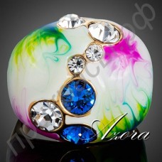 Предлагаемое украшение представляет собой полусферу белого цвета с чудесными масляными узорами розового, синего и зеленого цветов. Экстравагантный рисунок на поверхности кольца поможет подчеркнуть неоднозначность женской натуры и ее непредсказуемость. Также это удивительное украшение дополнено несколькими круглыми кристаллами различного размера, удивляющими яркостью синего и белого сияния.