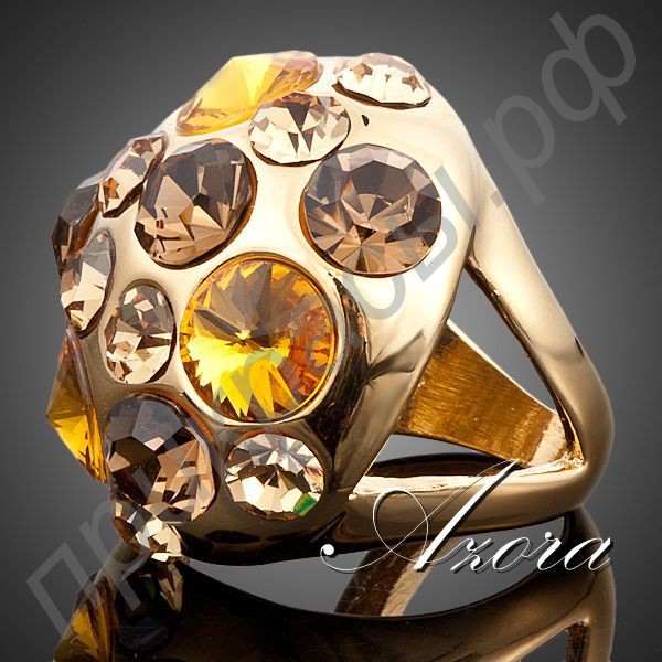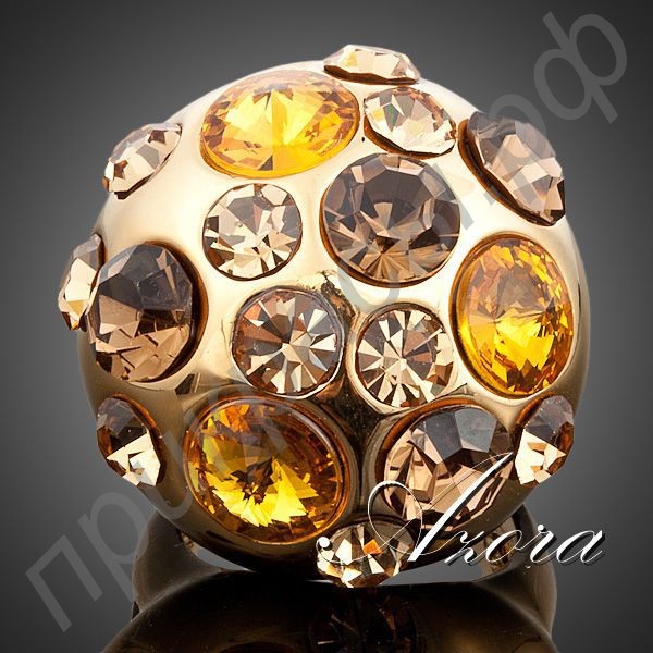 Это удивительное ювелирное изделие напоминает сказочный лунный камень, усеянный волшебными кристаллами. Его цветовая гамма основывается на сочетании чудесного блеска позолоты с оранжевыми, коричневыми кристаллами и камнями цвета шампанского, которые своим волшебным сиянием сделают облик дамы поистине сказочным. Корпус кольца изготовлен из цинкового сплава, который характеризуется прочностью, а также имеет небольшой вес, так что это достаточно большое украшение не будет отягощать жестов дамы. Позолота нанесена на него электрохимическим способом, который обеспечивает долгое сохранение превосходного вида и неповторимого блеска этого удивительного кольца.