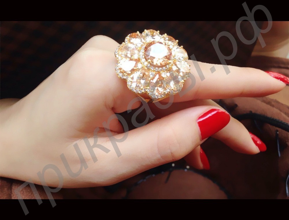 Этот завораживающий цветок выполнен из швейцарских фианитов удивительного оттенка шампанского, который превосходно сочетается с нарядами в любой цветовой гамме. Потрясающей красоты камни закреплены на корпусе, покрытом настоящей позолотой. Сочетание золотого сияния и блеска фианитов позволит каждой даме, выбравшей предлагаемое кольцо, выглядеть как настоящая королева. Данное украшение будет уместно в вечерних образах, его также можно использовать для дополнения деловых костюмов, чтобы на важном деловом ужине красота бизнесвумен покорила деловых партнеров, и они приняли все ее условия.