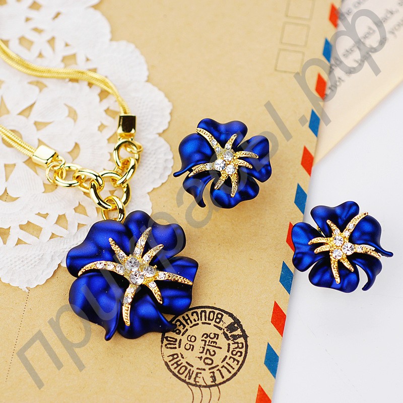 Эти удивительные украшения, инкрустированные швейцарскими фианитами, выполнены в виде чудесных цветов, поражающих своей изысканностью и утонченностью. Форма цветов настолько нежна, что кажется, будто они только что были сорваны с благоухающего луга. Ярко-синий оттенок украшений превосходно подойдет и роскошным блондинкам, и жгучим брюнеткам, и красавицам с огненно-рыжими волосами. Этот потрясающий набор будет актуально смотреться в сочетании с лаконичным деловым костюмом, придавая бизнесвумен уверенности в себе и делая ее образ более женственным. Серьги и ожерелье также станут прекрасным дополнением вечернего образа, их дизайн настолько элегантен, что данные украшения можно сочетать даже с самыми роскошными платьями.