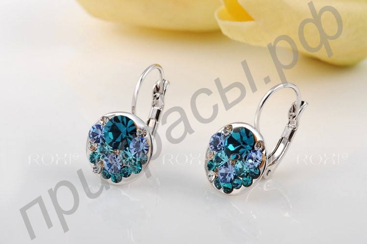 Эти завораживающие аксессуары имеют настолько необычный дизайн, что они помогут каждой девушке сосредоточить на себе все внимание мужчин. Достаточно простая круглая форма украшений дополняется их интересной инкрустацией при помощи разнообразных кристаллов разного размера и оттенка. Для дополнения данных изделий были использованы камни с глубоким синим оттенком, более светлые голубые кристаллы, а также множество декоративных элементов с неповторимыми переходными тонами. Довершает утонченность дизайна предлагаемых серег холодный металлический блеск корпуса.